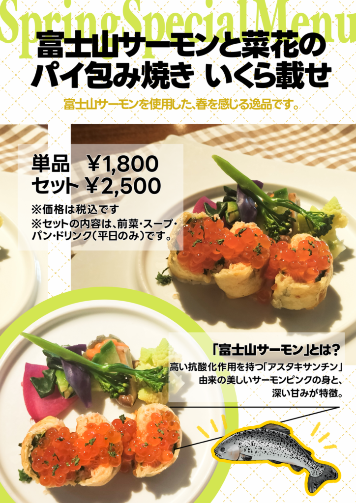 サーモンの甘みと菜花のほんのりとした苦味との組み合わせを楽しんで下さい。